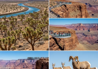 Stop at Arizona’s Joshua Tree Forest on the way to the Grand Canyon West. Approximately two and a half hours later, you will arrive at Grand Canyon West, located within the Hualapai Reservation. Experience the various areas of Grand Canyon West for approximately four hours. Enjoy views of Eagle Point, with the eagle's shape along the spine of the canyon ridge. Take a walk on the thrilling Skywalk, a glass bridge that arches out over the canyon wall. Explore the area around Guano Point, a breathtaking pinnacle offering views in all directions. Visit the displays of Native American dwellings and cultural exhibits. Experience a thrilling 15-to-20-minute helicopter ride that provides sights and views of rock formations and the Colorado River descending to the base of the Grand Canyon. Enjoy a leisurely boat ride over the Colorado River for 15 minutes as our professional wades through the river's calm waters. Fly back to Las Vegas on your plane. Depart the Grand Canyon, stopping on the return trip at the Mike O'Callaghan--Pat Tillman Memorial Bridge, and walk up the pedestrian walkway, overlooking the Hoover Dam and the Colorado River. Visit Boulder City’s Hemenway Park to see the famous bighorn sheep. Continue, for your return back to Las Vegas.